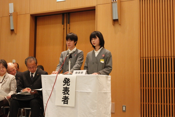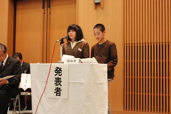 大山小学校の男女生徒2人が発表している写真 拡大画像 (JPEG: 143.8KB)