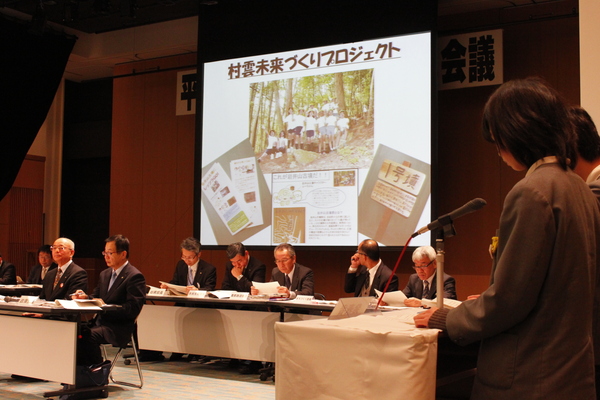 村雲未来づくりプロジェクトをスクリーンで写し、紹介する小学生と来賓の方が聞いている写真 拡大画像 (JPEG: 141.2KB)