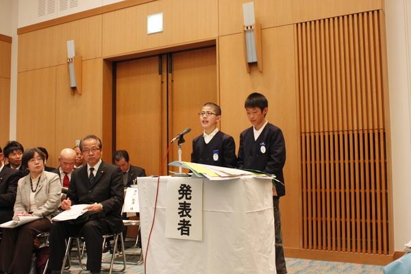 篠山小学校の生徒2人が発表している写真 拡大画像 (JPEG: 129.9KB)