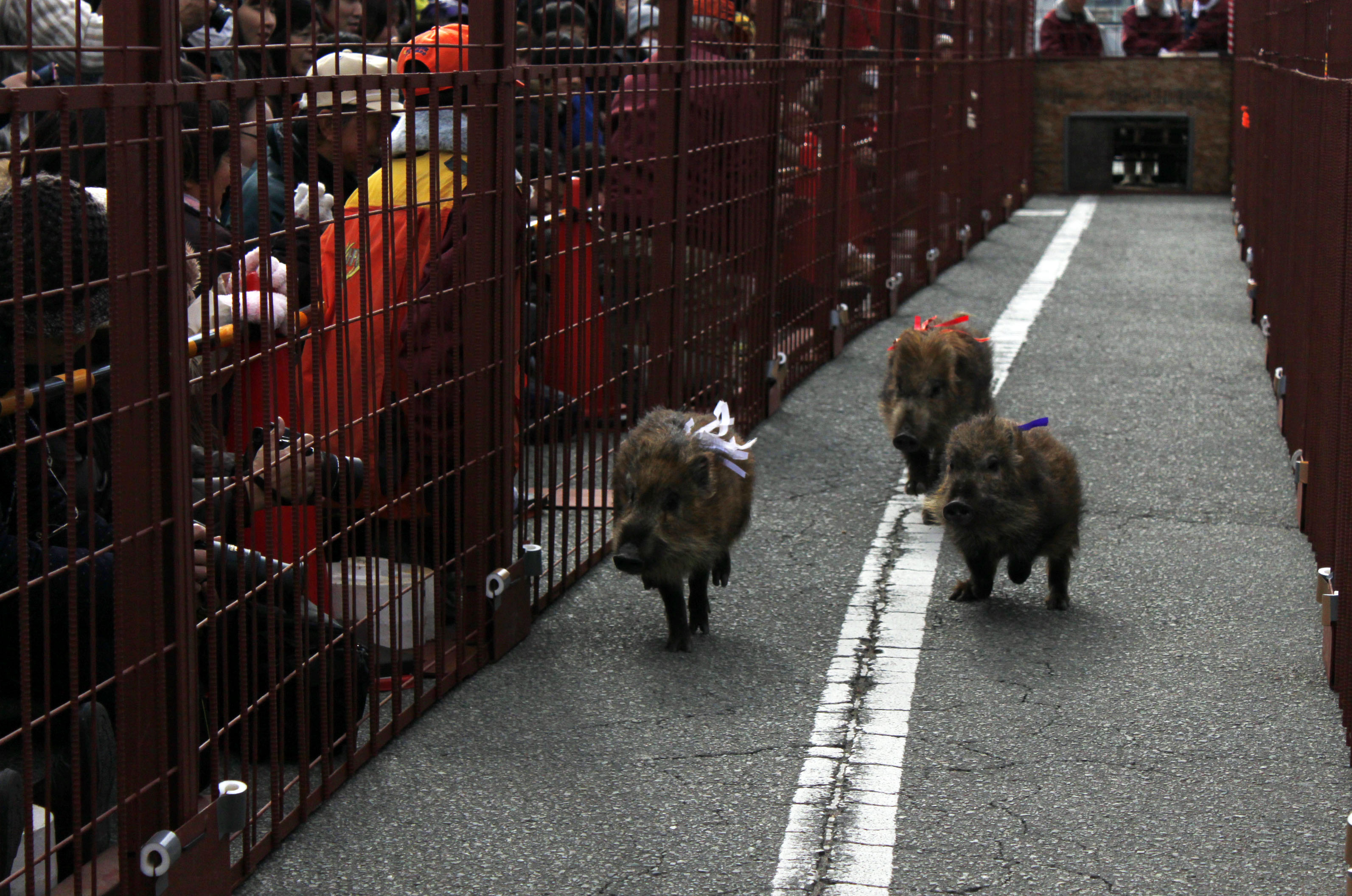 柵で囲まれた細長いコースを白、赤、青のリボンを首にまかれた小さな猪たちが走っている写真 拡大画像 (JPEG: 1.1MB)