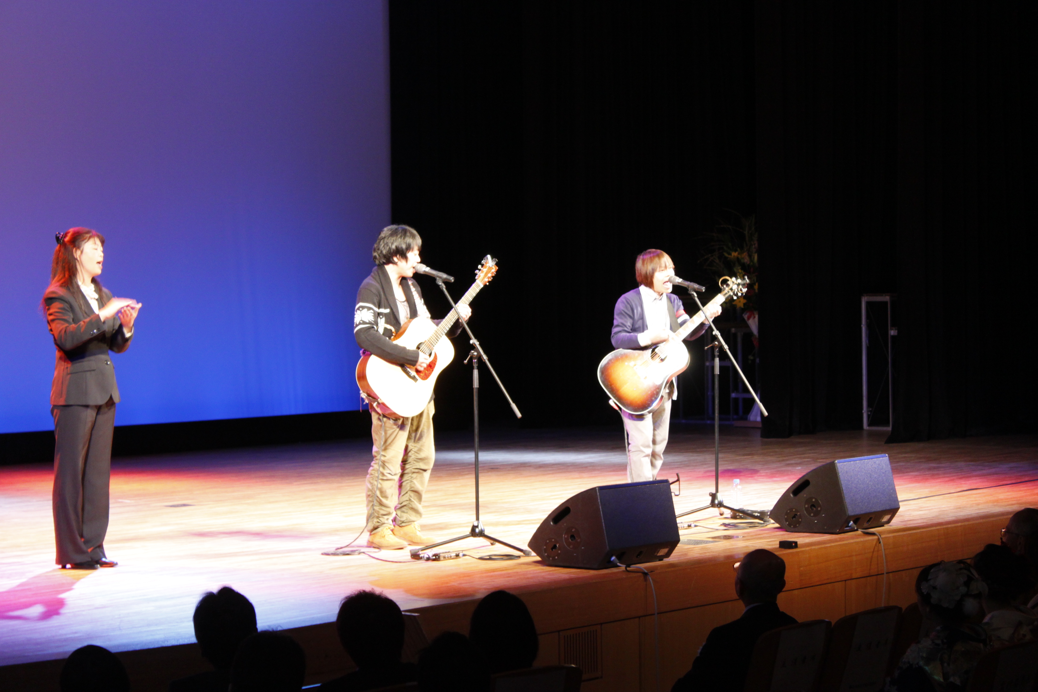舞台の上でギターを持った男性2人が歌を歌って、その横で手話をしている女性が立っている写真 拡大画像 (JPEG: 2.5MB)