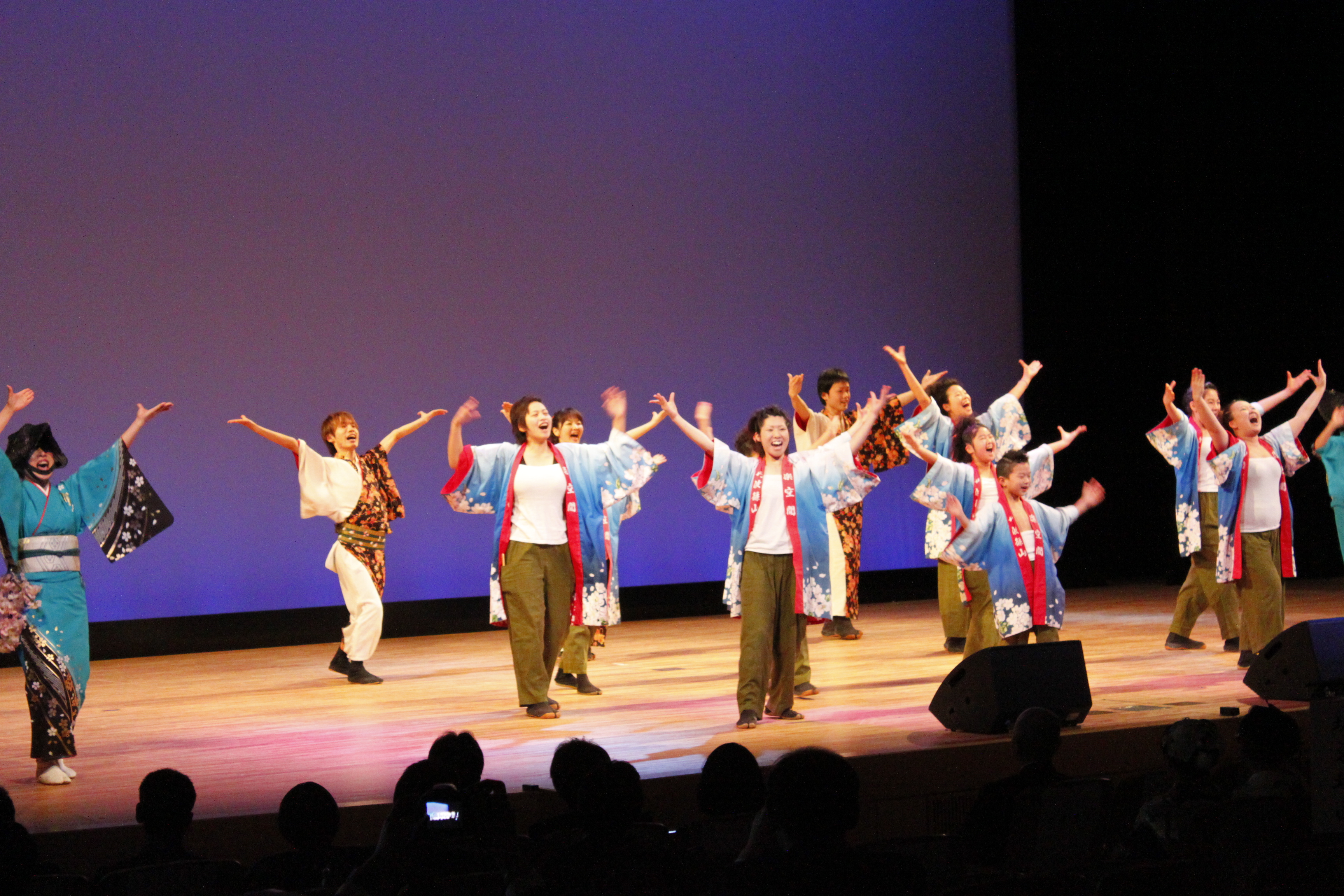 舞台の上で法被姿の人達が10名ほど立っていて、両手を大きく広げて踊っている写真 拡大画像 (JPEG: 3.5MB)