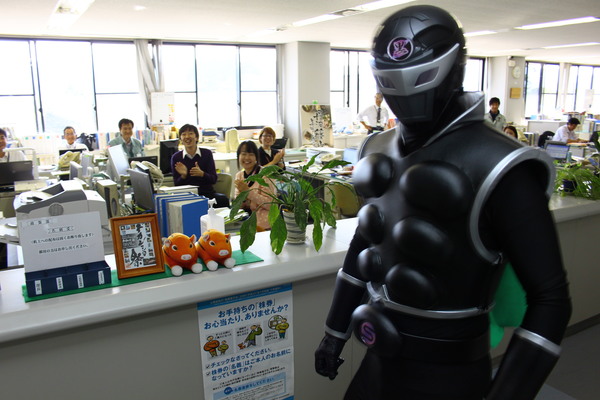 全身黒色の戦闘スーツに身を包んだササグローが市役所に現れ職員が笑顔で出迎えている写真 拡大画像 (JPEG: 72.8KB)