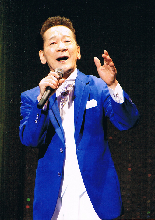 青いジャケットを着た、丹波 ひろしさんが、マイクを持ち歌っている写真 拡大画像 (BMP: 1.1MB)
