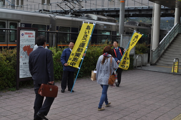 篠山市では、平成25年度から、毎月1日、11日、21日を「いいあいさつの日」と定めました。JR篠山口駅やスーパー、学校などであいさつを呼びかけています。