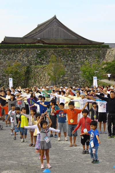 篠山城跡に集まる沢山の老若男女が、体操をしている写真 拡大画像 (JPEG: 107.9KB)
