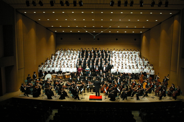 前方にはオーケストラが演奏し、後方には大勢のコーラスの方が隙間なく段々に並んでいる様子の写真 拡大画像 (JPEG: 172.0KB)