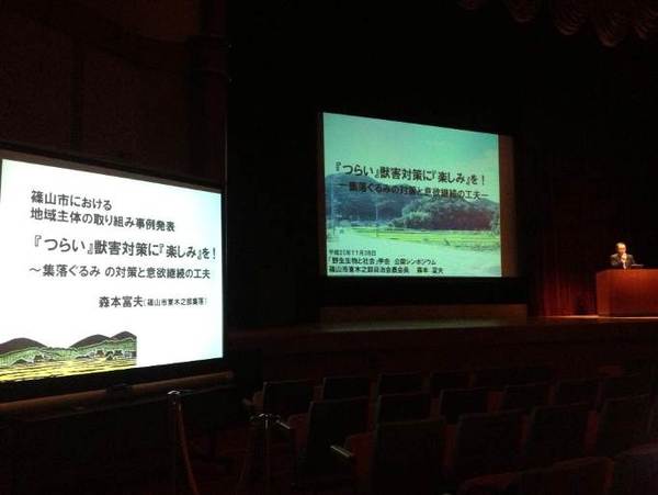今回の篠山大会の公開シンポジウムのテーマは、「地域で考える野生生物と社会の未来」、初日の28日には「兵庫県の鳥獣対策最前線」と題した公開シンポジウムが行われ、篠山市の大山地区のアライグマの捕獲と東木之部集落のサル追い払いの取組みが、先進事例として全国に発信されました。
