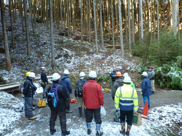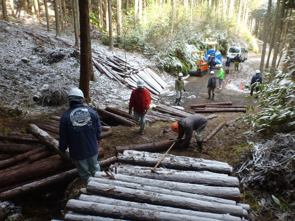 最終日となったこの日は、雪が舞うとても寒い一日でしたが、参加された皆さんは熱心に間伐材の搬出作業に取り組まれていました。
