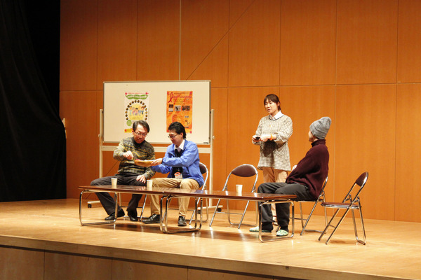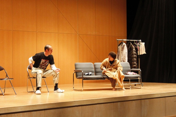 舞台の上でパイプ椅子に腰かけた男性と帽子を被った男性がソファーに腰かけて話をしている写真 拡大画像 (JPEG: 73.0KB)
