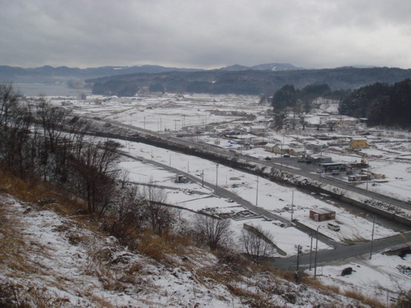雪が積もった、南三陸町全体を高台から見た写真 拡大画像 (JPEG: 120.2KB)