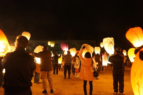 参加者たちがランタンを飛ばそうと手に持っている写真 拡大画像 (JPEG: 75.1KB)
