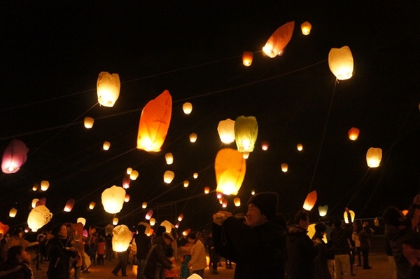 参加者たちがランタンを飛ばし、ランタンが空に舞い上がろうとしている写真 拡大画像 (JPEG: 67.8KB)
