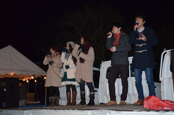 マフラーを首に巻いて、コートを着た3人の女性と2人の男性がトラックの荷台でアカペラを歌っている写真 拡大画像 (JPEG: 107.2KB)