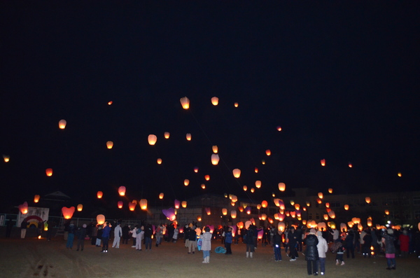 夕刻から始まったイベントは、神戸大学の学生グループによるアカペラコンサートで幕開け。その後、今回初めての試みとして、フライング・ランタンで夜空を彩りました。このランタンには、参加者の思いを込めた漢字2文字を書き込むなどの趣向もこらさせており、また、ラジオなどでのPRもあったためか、市内外の多くのカメラマンが詰めかける中で、盛大に開催されていました。そして最後は、恒例の花火で締めくくり。クライマックスを迎えると、見事な花火に会場からは大きな歓声が沸き起こっていました。
