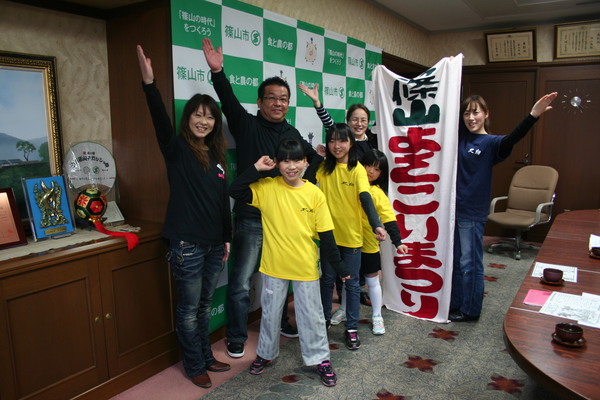 市長室でよさこいチームのメンバー5名が片手を上げてポーズをとって、後方に「篠山よさこいまつり」の垂れ幕を2名の女性が持っている写真 拡大画像 (JPEG: 83.5KB)