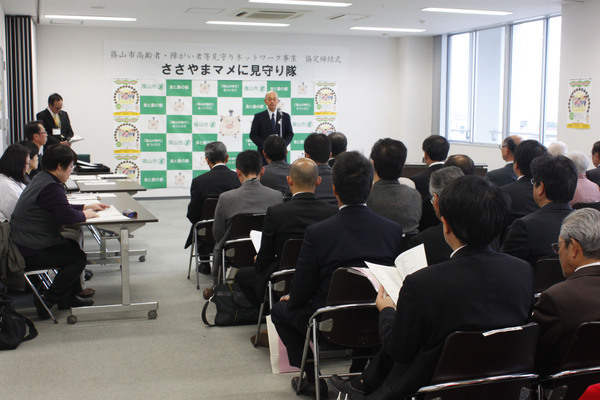 ささやまマメに見守り隊の方々の前で市長がお話をされている協定締結式の写真 拡大画像 (JPEG: 76.5KB)