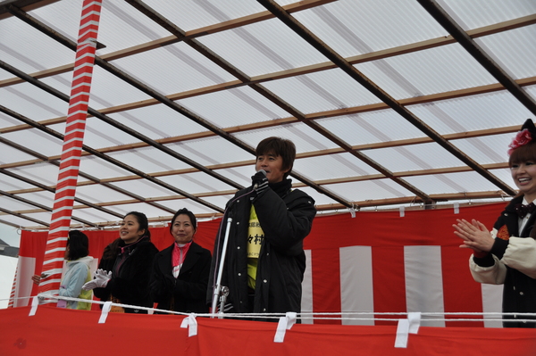 お笑いのかつみ・さゆりさんがスタンドマイクを使って笑顔で選手にお話ししている写真 拡大画像 (JPEG: 192.5KB)