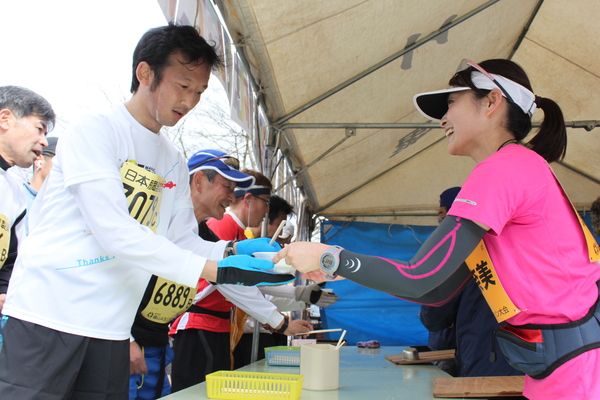 マラソンの途中、テントの中で食べ物が用意されて受け取っている写真 拡大画像 (JPEG: 157.1KB)