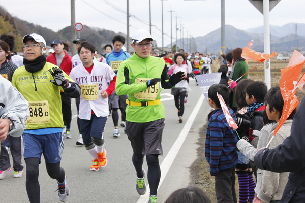 道路で一生懸命走っている選手に子供達が旗を振りながら応援している写真 拡大画像 (JPEG: 170.2KB)