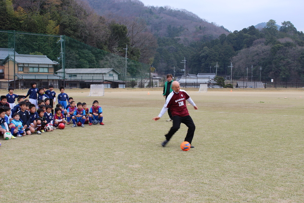 グラウンドにサッカー少年が集まって座っており、市長が子ども達の前でオレンジ色のサッカーボールをけっている様子の写真 拡大画像 (JPEG: 187.0KB)
