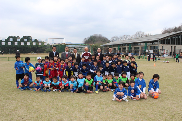 近藤 雅彦社長,市長、関係者及びサッカー少年・少女達がグラウンドに集まって写っている集合写真 拡大画像 (JPEG: 181.4KB)