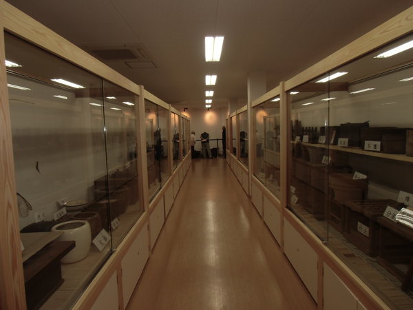 美術館の中のショーケースの中に陶器のようなものが飾られ、その奥に3名の男性が立っている写真 拡大画像 (JPEG: 38.9KB)
