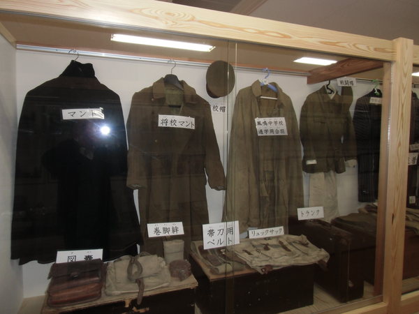 ショーケースの中に飾られた、高橋さんが航空士官学校時代に使用された将校の制服や鞄、帽子の写真 拡大画像 (JPEG: 44.1KB)
