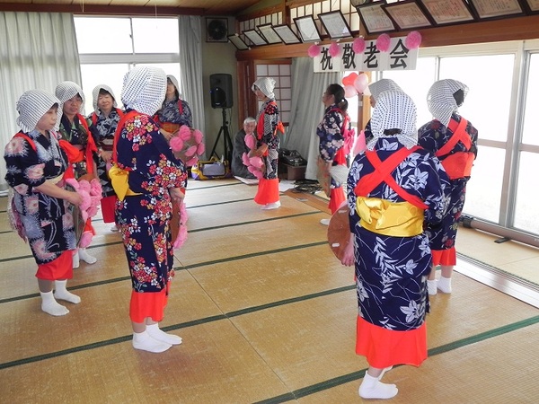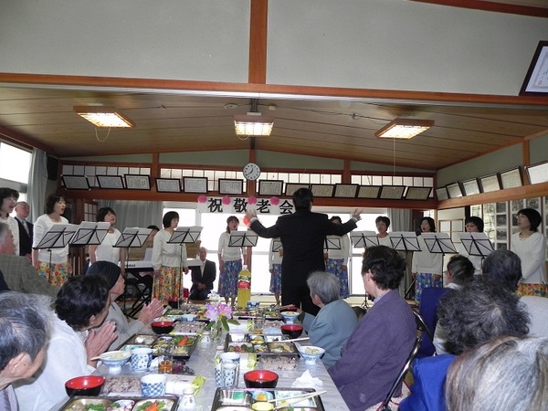 敬老会で女性の方達が歌を披露して、年配の方が聞きながら手拍子をしている写真 拡大画像 (JPEG: 111.6KB)
