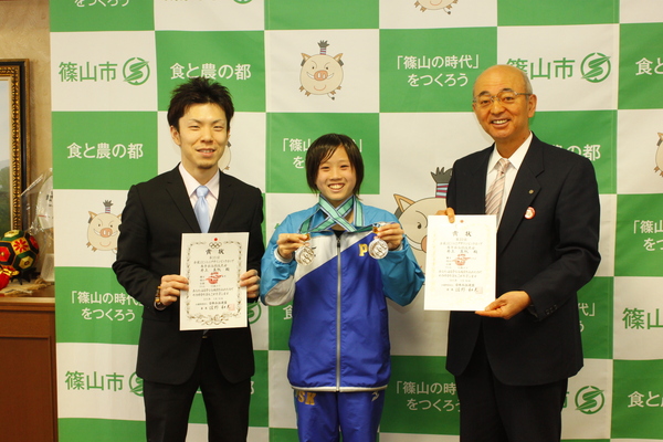 井上さんは、丹波市柏原町のPSK(ピュアスポーツ柏原)で練習をつんでおり、コーチの三藤さんと市長訪問をして頂きました。