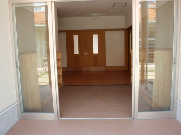 レンガ調の床の横に靴箱があり、奥にドアのあるリハビリ棟の入り口の写真 拡大画像 (JPEG: 171.3KB)