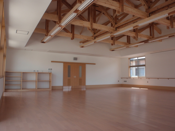 広い木の床が広がっていて、奥には棚とドアのあるリハビリ棟の室内が撮影されている写真 拡大画像 (JPEG: 154.6KB)