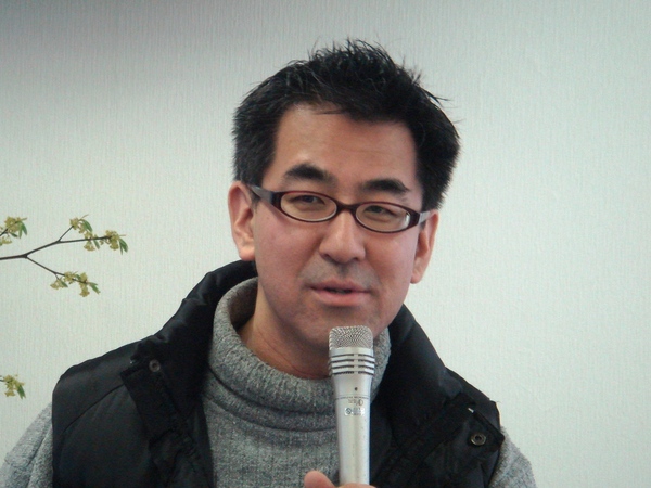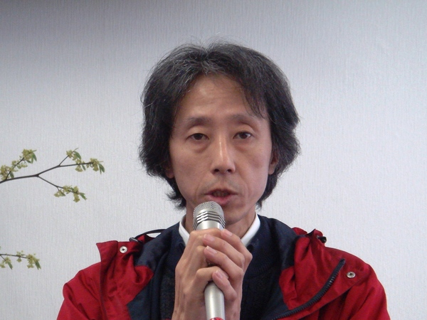 メガネを掛けており、マイクを持って話をしている竹内 照尚さんの写真 拡大画像 (JPEG: 105.5KB)