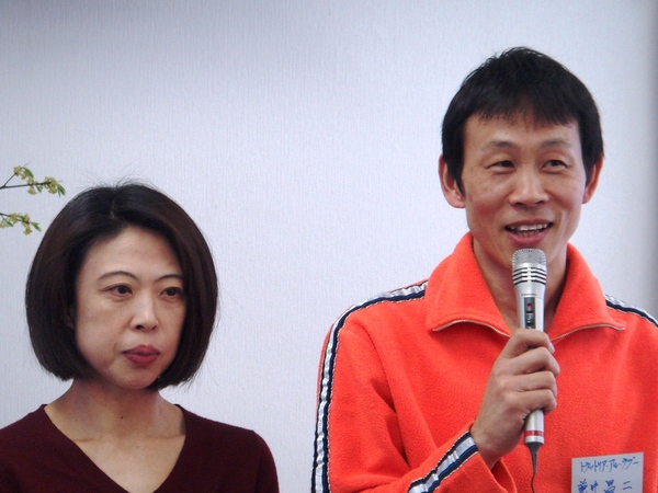 右側にオレンジ色の洋服を着ており、マイクを持って話をしている兼井 昌二さん,左側に紫の洋服を着ている奥様が写っている写真 拡大画像 (JPEG: 116.1KB)