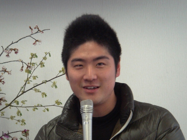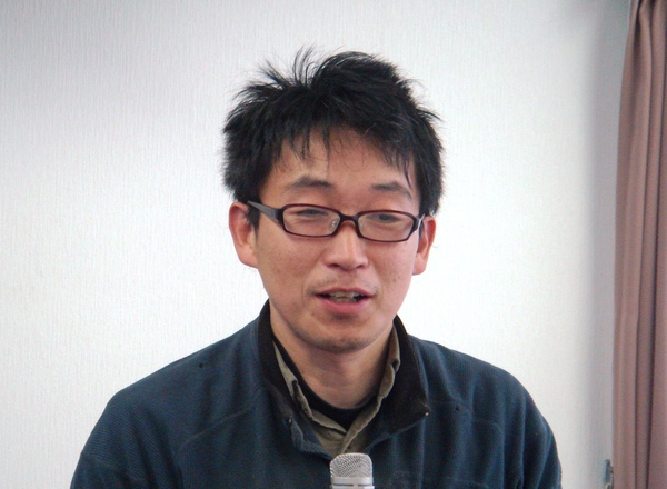 カーキ色のジャンパーを着ており、マイクを持って話をしている安達 鷹也さんの写真 拡大画像 (JPEG: 108.1KB)