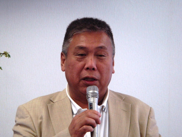 黒縁のメガネを掛けており、マスクをあごにずらして、マイクを持って話をしている初島 広治さんの写真 拡大画像 (JPEG: 119.8KB)