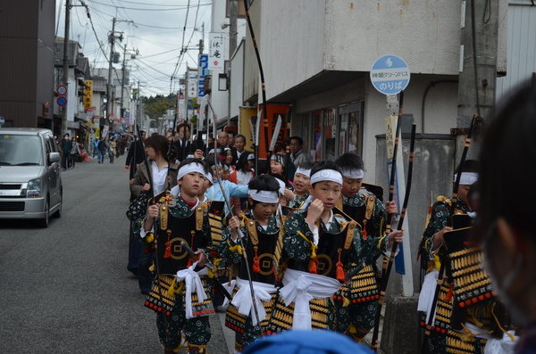 狭い道を鎧を羽織った子供達が歩き横をグレーの軽自動車が走っている写真 拡大画像 (JPEG: 210.0KB)