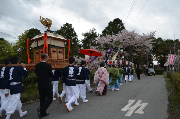 ピンク色の装束を着た男性の後ろをすぐ、神輿を担いでいる人たちの写真 拡大画像 (JPEG: 174.8KB)