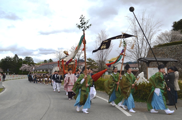 装束を着た人達を先頭に後ろから神輿を担ぐ人や子供達が歩いている写真 拡大画像 (JPEG: 139.9KB)