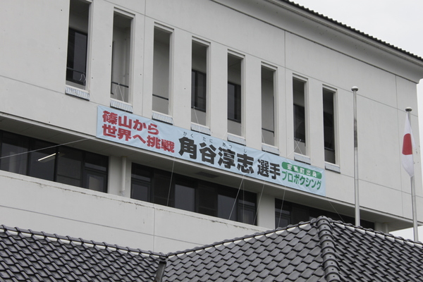 篠山市役所に掛けられた、角谷 淳志選手の名前が入った横断旗の写真 拡大画像 (JPEG: 123.4KB)