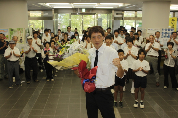 急な呼びかけにも関わらず、出身校である篠山小学校、篠山中学校、東雲高校の後輩達や、東新町の自治会の皆さん、住民の皆さんや、市職員ら100人が駆けつけ、角谷選手へエールを送りました。