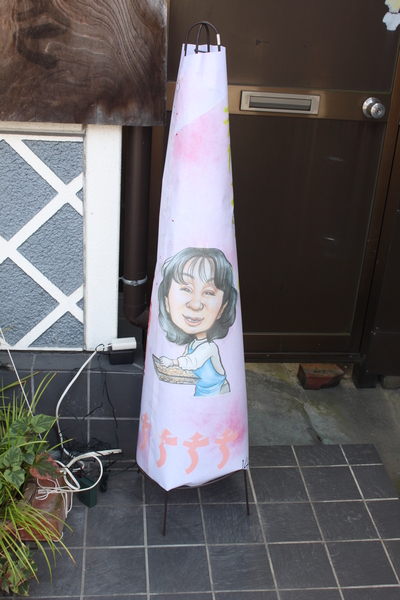 ドアの前にエプロンを着た女性が描かれたあんどんが置いてある写真 拡大画像 (JPEG: 136.1KB)