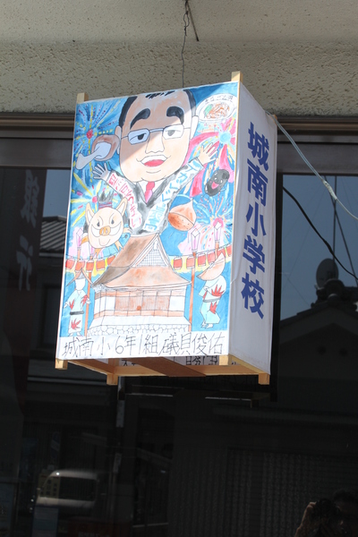 小学6年生の磯貝くん作の市長と市のキャラクターの描かれた灯篭がドアの前にかけられている写真 拡大画像 (JPEG: 137.9KB)