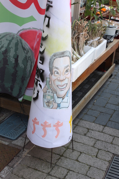 すいかの描かれた上り旗の前に酒を持った男性が描かれているあんどんが置いてある写真 拡大画像 (JPEG: 163.4KB)