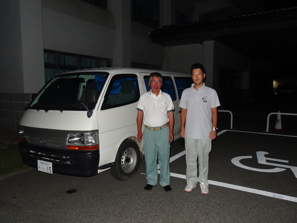 ブルーシート100枚を乗せた車の前で市民安全課山本 寿幸課長と森本 良太主査が映っている写真 拡大画像 (JPEG: 72.7KB)
