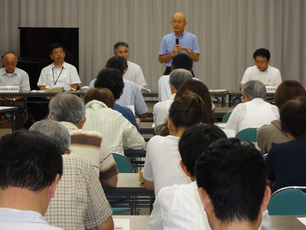 今田会場でたくさんの参加者が長机の資料を見ながら、正面の市長の話を聞いている様子を後ろから写した写真 拡大画像 (JPEG: 98.8KB)