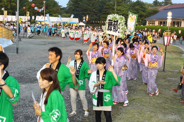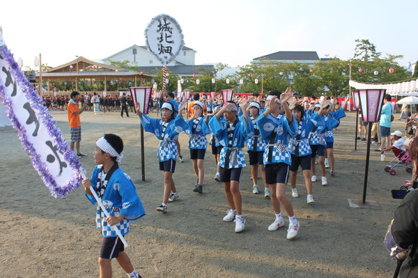 円をつくりそれぞれお揃いの浴衣や、法被を着て踊る参加者の写真 拡大画像 (JPEG: 132.9KB)