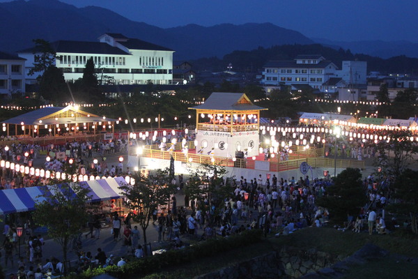 明かりに照らされ浮かび上がる巨大櫓 篠山の夏の風物詩です