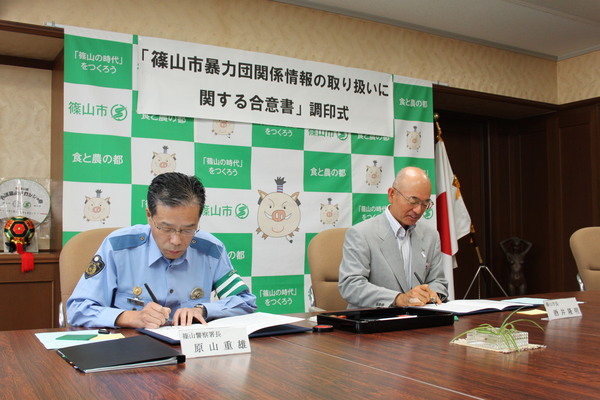 篠山市暴力団排除条例の施行に伴い、市の事務及び事業から暴力団排除の推進に関し、篠山警察署長と合意書の締結を行いました。
