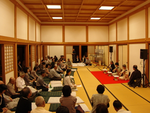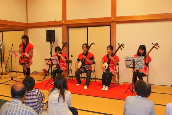 着物を着た3名の女性が三味線を弾いており、その様子を真剣に鑑賞している方々の写真 拡大画像 (JPEG: 181.5KB)